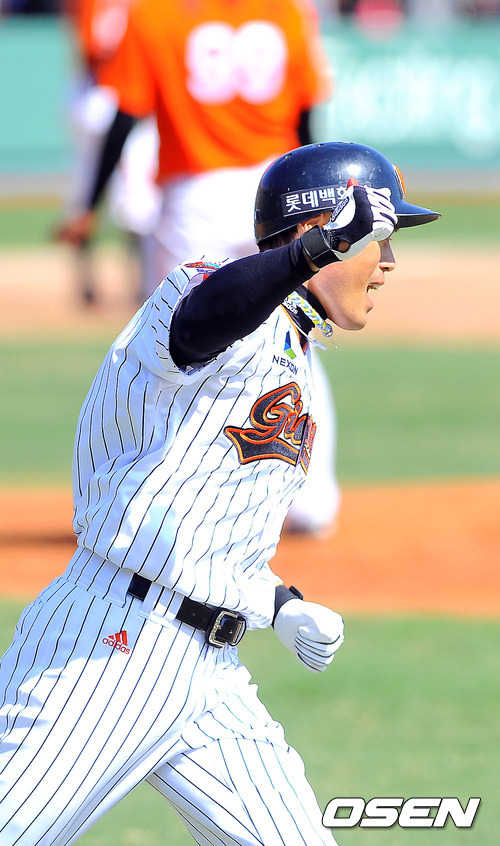 7일 오후 부산 사직구장에서 열린 2012 팔도 프로야구 개막전 롯데 자이언츠와 한화 이글스의 경기 1회말 1사 롯데 조성환이 선취 솔로홈런을 날리고 환호하고 있다.