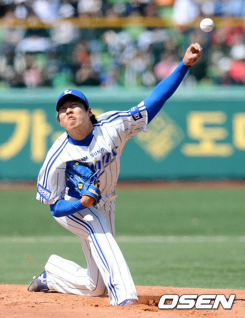 7일 오후 대구야구장에서 열린 '2012 팔도 프로야구' 삼성 라이온즈와 LG 트윈스의 개막전 경기, 1회초 무사에서 삼성 선발 차우찬이 힘차게 공을 던지고 있다.