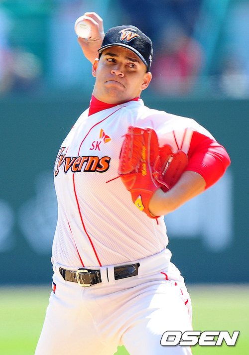 7일 오후 인천 문학구장에서 '2012 팔도 프로야구' SK 와이번스와 KIA 타이거즈의 2012시즌 공식 개막전에서 SK 선발 마리오가 힘차게 공을 뿌리고 있다.