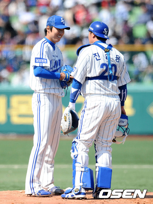 7일 오후 대구야구장에서 열린 '2012 팔도 프로야구' 삼성 라이온즈와 LG 트윈스의 개막전 경기, 1회초 1사 3루 LG 최동수에게 볼넷으로 출루를 허용한 삼성 차우찬이 포수 진갑용과 이야기를 나누고 있다.