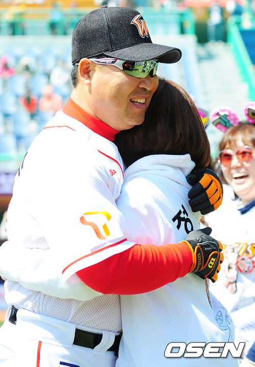 7일 오후 인천 문학구장에서 '2012 팔도 프로야구' SK 와이번스와 KIA 타이거즈의 2012시즌 공식 개막전에서 개막식 중 SK 이만수 감독이 팬과 뜨거운 포옹을 나누고 있다.
