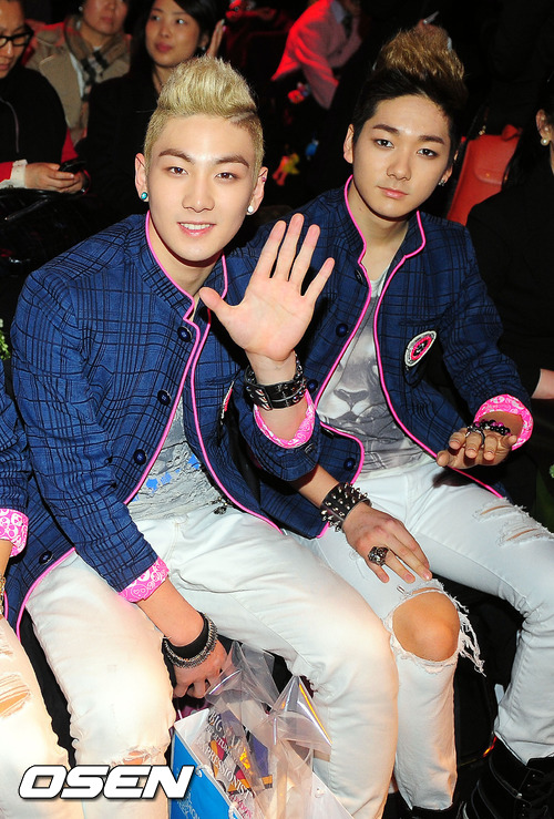 7일 오후 서울 잠실 올림픽공원에서 열린 '2012-2013 춘계 서울패션위크' 박윤수 패션쇼 시작전 그룹 뉴이스트 멤버 백호와 아론이 객석에서 패션쇼를 기다리고 있다.