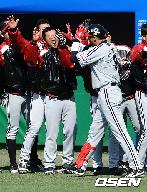 7일 오후 대구야구장에서 열린 '2012 팔도 프로야구' 삼성 라이온즈와 LG 트윈스의 개막전 경기, 3회초 무사 만루 LG 이병규가 만루 홈런을 덕아웃에서 이병규의 축하를 받고 있다.