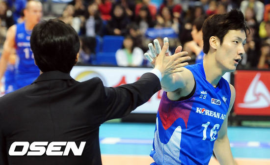 7일 오후 대전 충무체육관에서 열린 '2011-2012 NH농협 V리그' 남자부 챔피언결정전 1차전 삼성화재와 대한항공의 경기 1세트 대한항공 진상헌이 신영철 감독과 하이파이브를 하고 있다.