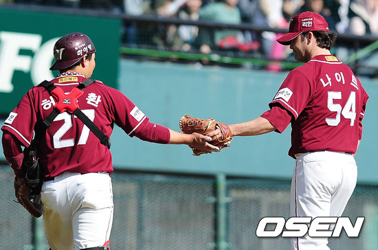 5회말 수비를 마친 넥센 나이트와 허도환이 하이파이브를 하고 있다.