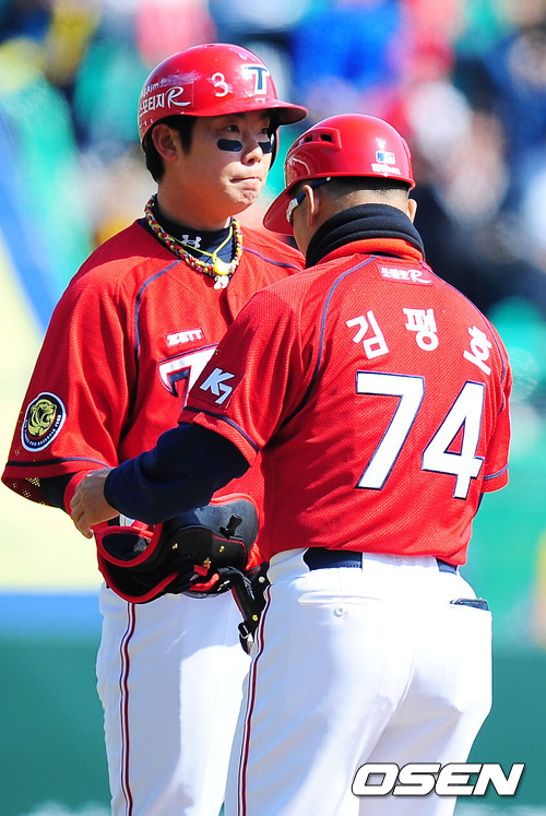 7일 오후 인천 문학구장에서 '2012 팔도 프로야구' SK 와이번스와 KIA 타이거즈의 2012시즌 공식 개막전 3회초 2사 주자 1루 KIA 나지완이 좌익수 오른쪽 1타점 적시타를 날린 후 2루에서 김평호 코치와 하이파이브를 하고 있다.