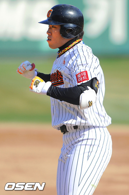 7일 오후 부산 사직구장에서 열린 2012 팔도 프로야구 개막전 롯데 자이언츠와 한화 이글스의 경기 5회말 1사 2루 롯데 전준우가 1타점 적시타를 날린 후 주먹을 쥐며 환호하고 있다