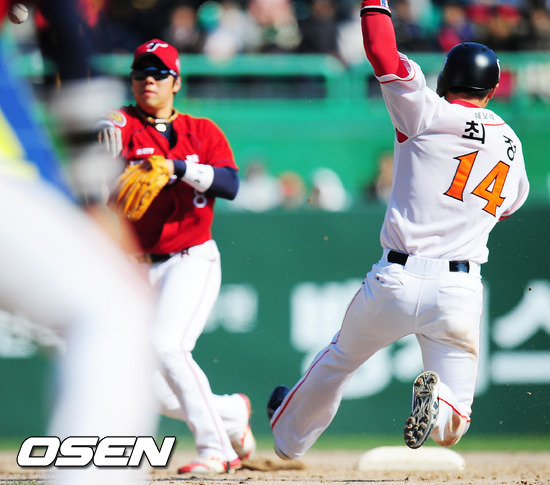7일 오후 인천 문학구장에서 '2012 팔도 프로야구' SK 와이번스와 KIA 타이거즈의 2012시즌 공식 개막전에서 5회말 무사 주자 1루 SK 안치용의 유격수 병살타때 1루 주자 최정이 2루에서 포스아웃 당하고 있다.