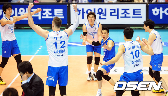 7일 대전 충무체육관에서 열린 2011-2012 NH농협 V리그 챔피언결정전 1차전 경기서 삼성화재가 세트스코어 3-1(26-24, 22-25, 25-22, 36-34)로 대한항공에 승리를 거두고 챔피언결정전에서 귀중한 선승을 챙겼다.