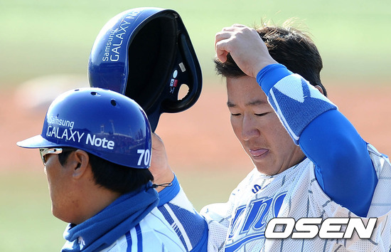 7일 오후 대구야구장에서 열린 '2012 팔도 프로야구' 삼성 라이온즈와 LG 트윈스의 개막전 경기, 8회말 1사 1루 삼성 최형우가 우전 1타점 적시타를 치고 1루에서 땀을 닦고 있다.