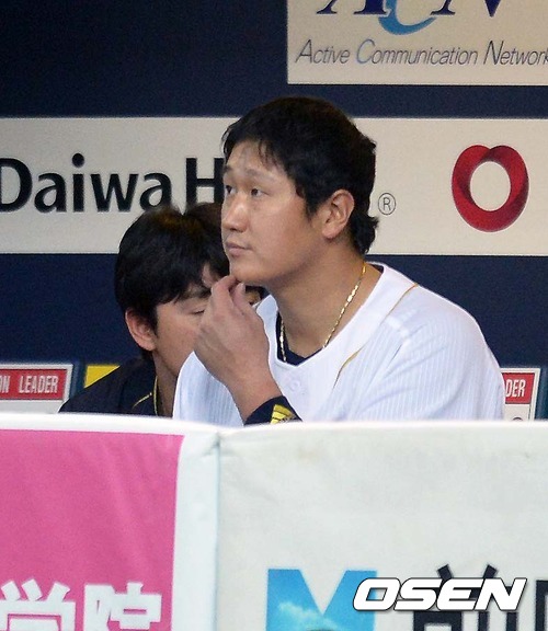 경기 종료후 이대호가 덕아웃에서 아쉬워하고 있다.