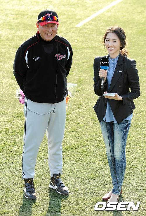 경기 후 LG 김기태 감독이 XTM 조유영 아나운서와 인터뷰를 갖고 있다.