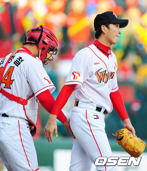 경기를 마치고 SK 정우람과 최경철이 하이파이브를 하고 있다. / rumi@osen.co.kr