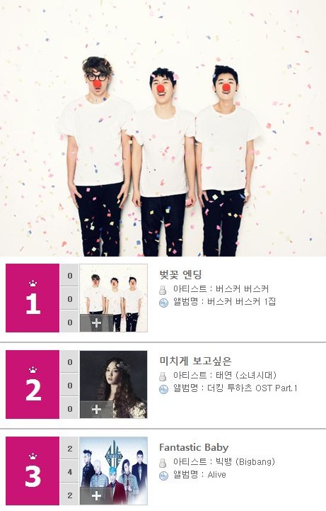 버스커버스커에 이어 2위에는 MBC 드라마 '더킹 투 하츠'의 OST '미치게 보고 싶은'을 부른 태연이 올랐으며 3위에는 발매 한 달이 훌쩍 지난 지금까지 여전히 인기를 과시하고 있는 빅뱅의 '판타스틱 베이비'가 차지했다.