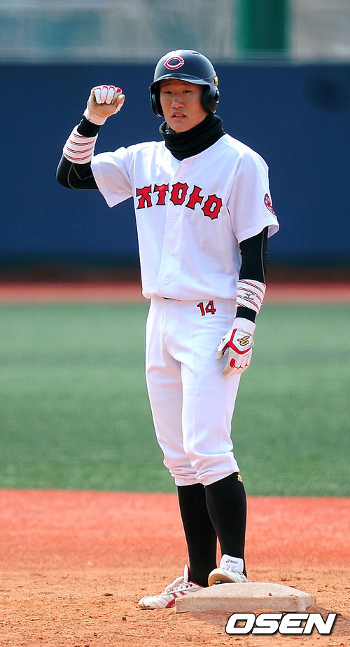 8일 오전 서울 신월동 신월야구장에서 열린 '2012 고교야구 주말리그' 휘문고와 중앙고의 경기 6회말 1사 중앙고 공상현이 2타점 2루타를 때리고 기뻐 하고 있다.