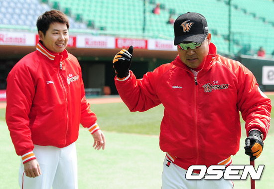 경기전 이날 은퇴식을 갖는 김원형이 이만수 감독과 인사를 나누고 있다.