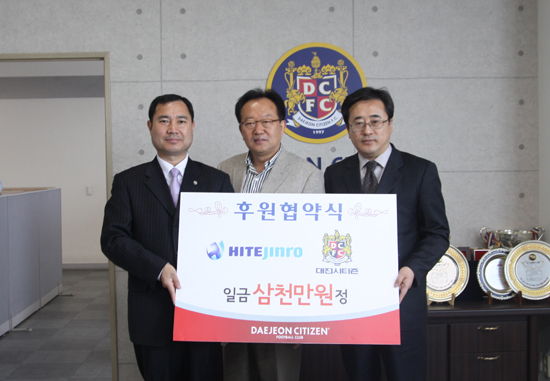 대전은 "하이트진로가 대전과 후원협약을 맺고 후원금을 전달하며 대전의 승리를 응원했다"고 밝혔다.