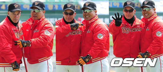 경기전 SK 조 알바레즈 코치와 이만수 감독이 카메라를 향해 포즈를 취하고 있다.
