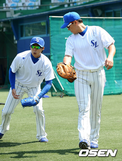 8일 오후 대구야구장에서 열린 '2012 팔도 프로야구' 삼성 라이온즈와 LG 트윈스의 경기, 경기 전 삼성 이승엽이 수비 훈련을 하고 있는 배영수에게 장난을 치고 있다.