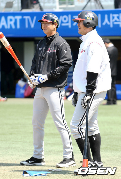 8일 오후 대구야구장에서 열린 '2012 팔도 프로야구' 삼성 라이온즈와 LG 트윈스의 경기, 경기 전 LG 박용택과 최동수가 타격 훈련 중 환하게 웃고 있다.