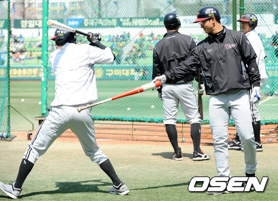 8일 오후 대구야구장에서 열린 '2012 팔도 프로야구' 삼성 라이온즈와 LG 트윈스의 경기, 경기 전 LG 박용택이 정성훈의 타격 훈련을 돕고 있다.
