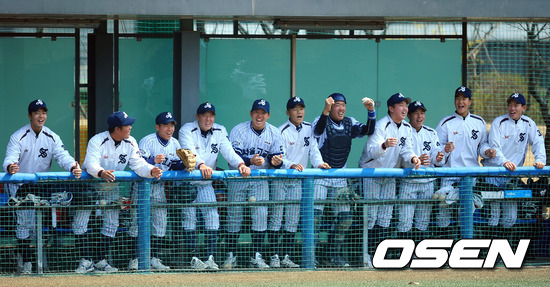 8일 오전 서울 신월동 신월야구장에서 열린 '2012 고교야구 주말리그' 배재고와 서울고의 경기 4회초 서울고 선수들이 덕아웃에서 선발투수 장현식을 응원하고 있다.
