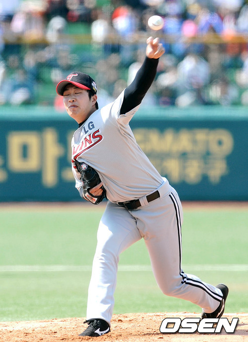 8일 오후 대구야구장에서 열린 '2012 팔도 프로야구' 삼성 라이온즈와 LG 트윈스의 경기, 1회말 LG 선발 이승우가 힘차게 공을 던지고 있다.