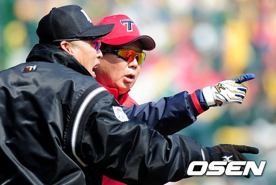 2회말 2사 만루에서 SK 임훈이 선제 3타점 싹쓸이 적시 3루타를 날리자, KIA 선동렬 감독이 임훈의 타구가 파울이라며 박근영 구심에게 불만을 나타내고 있다.