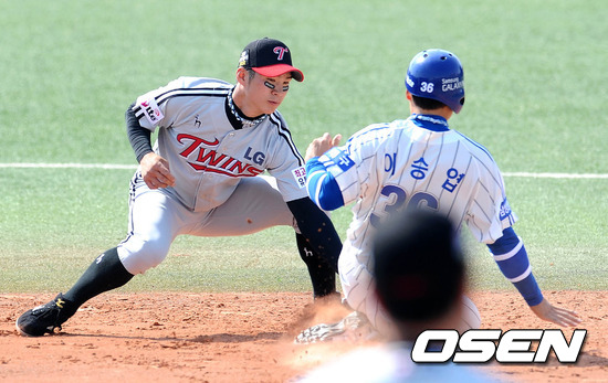 8일 오후 대구야구장에서 열린 '2012 팔도 프로야구' 삼성 라이온즈와 LG 트윈스의 경기, 3회말 1사 1루 삼성 최형우의 내야 땅볼때 1루주자 이승엽이 포스 아웃 되고 있다.