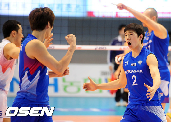 8일 오후 대전 충무체육관에서 열린 '2011-2012 NH농협 V리그' 남자부 챔피언결정전 2차전 삼성화재와 대한항공의 경기 1세트 대한항공이 득점 성공 후 한선수와 곽승석이 환호하고 있다.