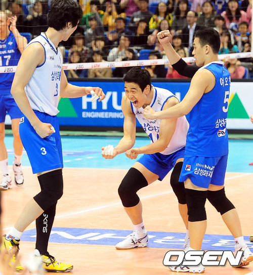 8일 오후 대전 충무체육관에서 열린 '2011-2012 NH농협 V리그' 남자부 챔피언결정전 2차전 삼성화재와 대한항공의 경기 2세트 삼성화재가 득점 성공 후 고희진이 환호하고 있다.