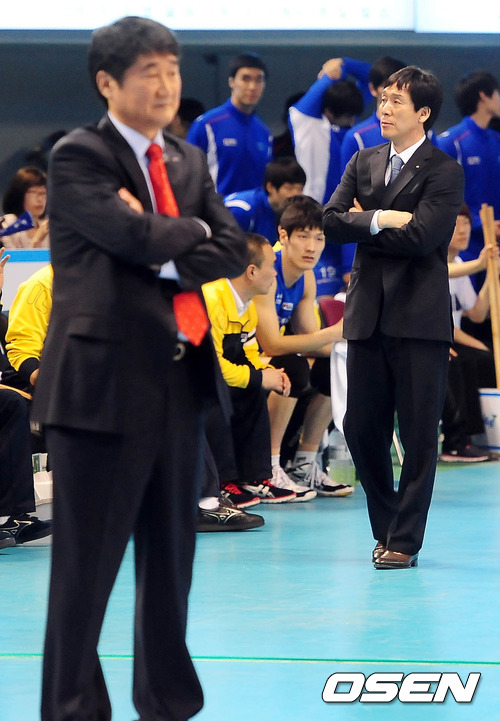 8일 오후 대전 충무체육관에서 열린 '2011-2012 NH농협 V리그' 남자부 챔피언결정전 2차전 삼성화재와 대한항공의 경기 2세트 신치용 감독(왼쪽)과 신영철 감독이 경기를 지켜보고 있다.