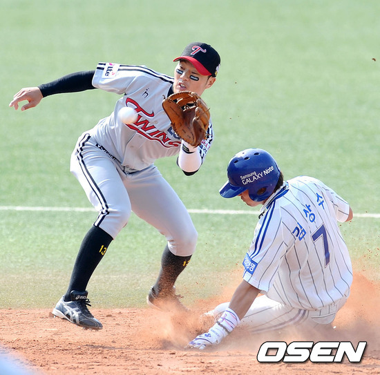 8일 오후 대구야구장에서 열린 '2012 팔도 프로야구' 삼성 라이온즈와 LG 트윈스의 경기, 5회말 1사 1루 삼성 강봉규 타석때 1루주자 김상수가 도루에 성공하고 있다.