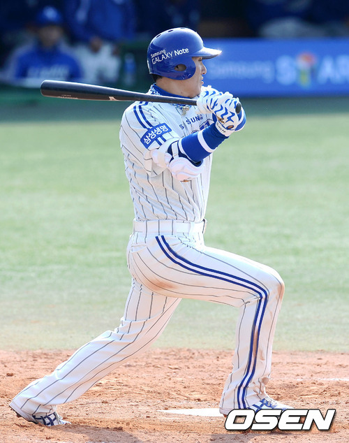 8일 오후 대구야구장에서 열린 '2012 팔도 프로야구' 삼성 라이온즈와 LG 트윈스의 경기, 5회말 2사 2루 삼성 이승엽이 우전 안타를 치고 있다.