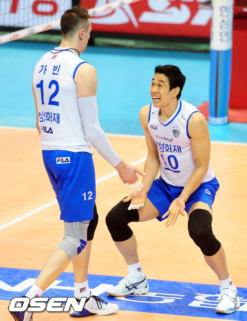 8일 오후 대전 충무체육관에서 열린 '2011-2012 NH농협 V리그' 남자부 챔피언결정전 2차전 삼성화재와 대한항공의 경기 2세트 삼성화재가 득점 성공 후 고진희가 가빈을 보며 환호하고 있다.