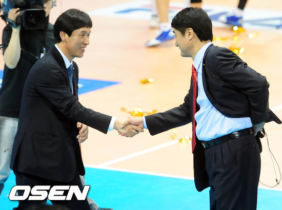 8일 오후 대전 충무체육관에서 열린 '2011-2012 NH농협 V리그' 남자부 챔피언결정전 2차전 삼성화재와 대한항공의 경기 종료 후 신치용 감독(오른쪽)과 신영철 감독이 악수를 나누고 있다.
