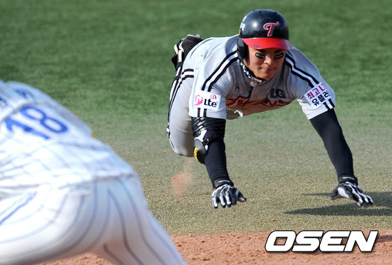 8일 오후 대구야구장에서 열린 '2012 팔도 프로야구' 삼성 라이온즈와 LG 트윈스의 경기, 8회초 1사 2루 LG 오지환이 1타점 중전 안타를 치고 3루에서 슬라이딩을 하고 있다.