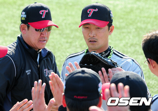 8일 오후 대구야구장에서 열린 '2012 팔도 프로야구' 삼성 라이온즈와 LG 트윈스의 경기, 8회말 2사 1루 삼성 진갑용 타석때 LG 류택현이 한희로 교체되며 덕아웃에서 동료들의 축하를 받고 있다.