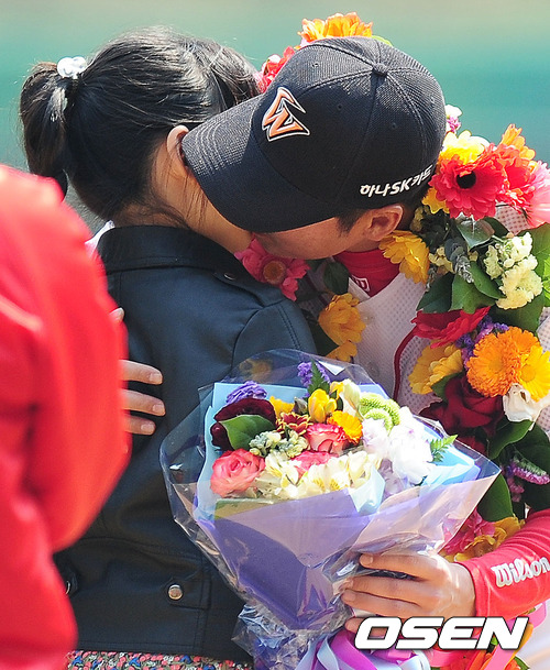 경기전 SK 김원형이 은퇴식을 갖고 딸과 키스를 하고 있다./ jpnews@osen.co.kr