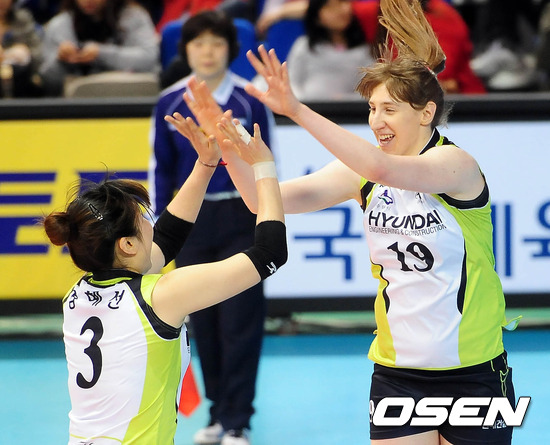 8일 오후 대전 충무체육관에서 열린 '2011-2012 NH농협 V리그' 여자부 챔피언결정전 5차전 KGC인삼공사와 현대건설의 경기 1세트 현대건설이 득점 성공 후 브란키차와 염혜선이 하이파이브를 하고 있다.