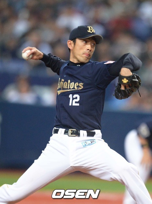 1회초 오릭스 선발 기사누키가 공을 뿌리고 있다.