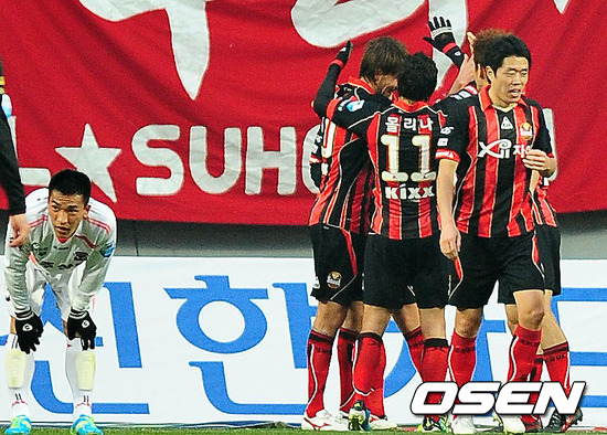 8일 오후 서울드컵경기장에서 열린 '현대오일뱅크 K리그 2012' FC 서울과 상주 상무의 경기 후반 서울 데얀이 두번째 골을 넣고 선수들과 기뻐하고 있다.