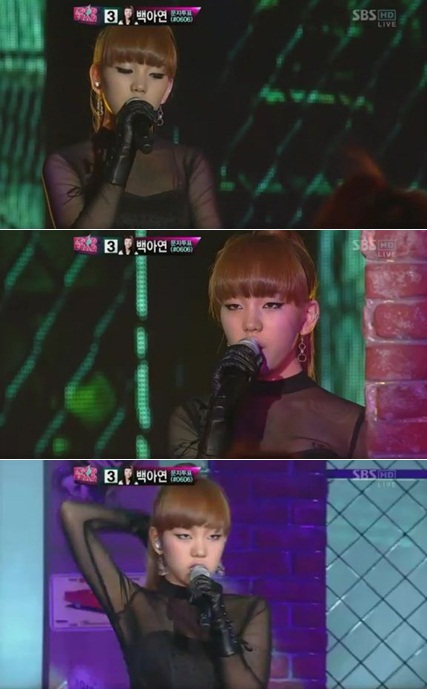 이날 세 번째로 무대에 오른 백아연은 소녀시대 '런 데빌 런'을 선곡, 지금껏 보여줬던 무대와는 다른 모습으로 눈길을 끌었다. 특히 강렬한 눈빛과 안무로 좌중을 압도했다.
