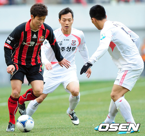 전반 서울 김태환이 상무 김치우,용현진에게 둘러 싸여 있다./youngrae@osen.co.kr