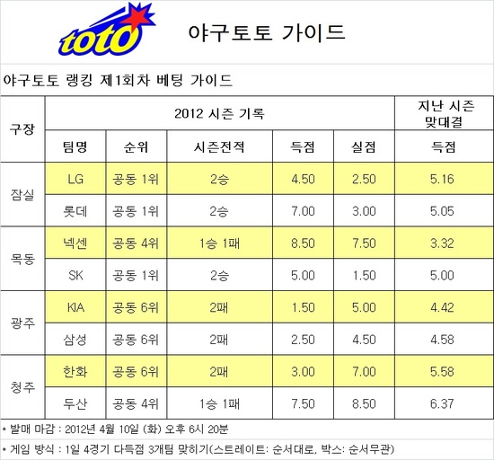 국민체육진흥공단(www.kspo.or.kr)이 발행하는 체육진흥투표권 수탁사업자인 스포츠토토 공식 온라인 발매 사이트인 베트맨(www.betman.co.kr)이 오는 10일 오후 6시 30분에 열리는 2012 프로야구 4경기 8개팀을 대상으로 한 야구토토 랭킹 1회차 스트레이트 게임을 중간집계한 결과, 참가자들은 삼성(44.22%), 한화(41.44%), 롯데(41.37%) 순으로 다득점 상위 3개팀을 꼽았다. 반면 넥센(34.77%)과 KIA(25.69%)는 가장 적은 득점을 기록할 것으로 예상됐다.