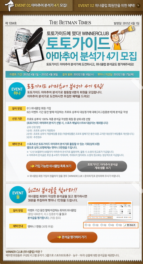 '토토가이드 아마추어 분석가 모집'은 위너클럽 회원가입 후 이벤트 기간 동안 발매하는 프로토 승부식 대상경기에 대해 위너클럽의 리그 집중분석 게시판에 분석글을 작성하면 참가할 수 있다. 위너클럽이란 베트맨 회원들로 구성된 리그별 소규모 분석가 그룹들이 스포츠토토(축구, 농구, 야구 등) 상품에 대한 분석글을 제공하는 공간이다. 내부 심사 기준에 따라 상위 6명에게는 스포츠조선 토토가이드 아마추어 분석가로 활동할 수 있는 기회가 부여되고, 별도로 상위 20명에게는 벳머니 5만원이 지급된다.