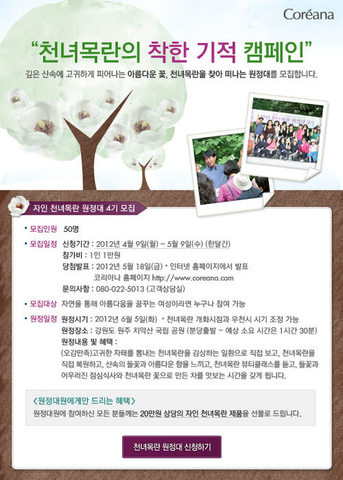 4월 9일부터 5월 9일까지 코리아나 홈페이지(www.coreana.com) 천녀목란 원정대 이벤트 페이지에서 응모할 수 있으며 참가비는 1만 원이다. 총 50명이 선발되는 이번 천녀목란 원정대 4기의 당첨자는 5월 18일 코리아나 홈페이지에서 확인 가능하다.