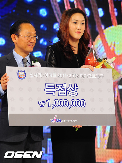 9일 오후 서울 용산구 한남동 그랜드하얏트호텔 그랜드볼룸에서 열린 WKBL 신세계이마트 2011-2012 여자프로농구 시상식에서 김정은(신세계)이 득점상을 수상하고 있다.