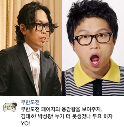 실제로 이날 오전 '무한도전' 페이스북 페이지에는 "무한도전 페이지의 용감함을 보여주지. 김태호! 박성광! 누가 더 못생겼나 투표하자 YO!"라는 글이 게재됐다.