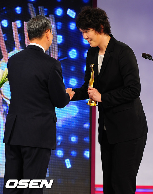 9일 오후 서울 용산구 한남동 그랜드하얏트호텔 그랜드볼룸에서 열린 WKBL 신세계이마트 2011-2012 여자프로농구 시상식에서 하은주(신한은행) 2점 야투상을 수상하고 있다.